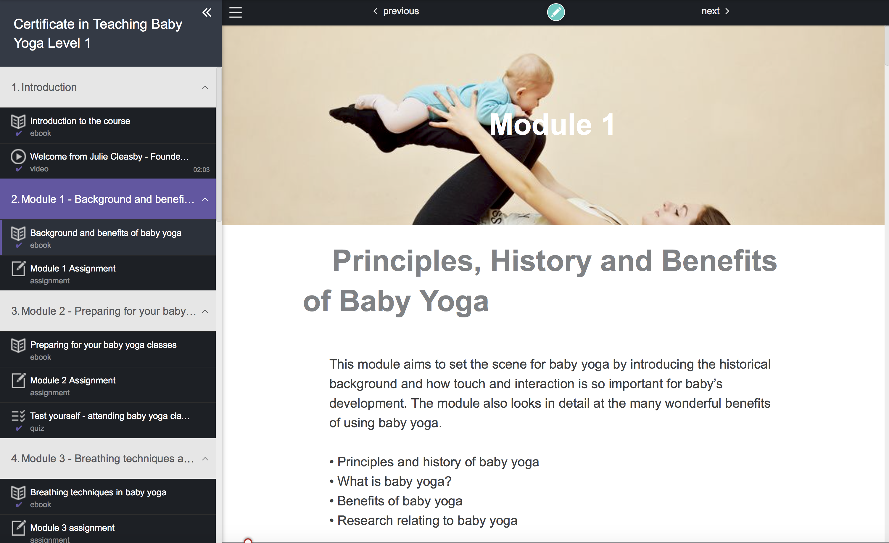 It’s perfect for learning how to teach baby yoga and works via a series of practical video demonstrations and presentations, that can be paused, practised and watched again in your own time. Take a look at the course syllabus here.